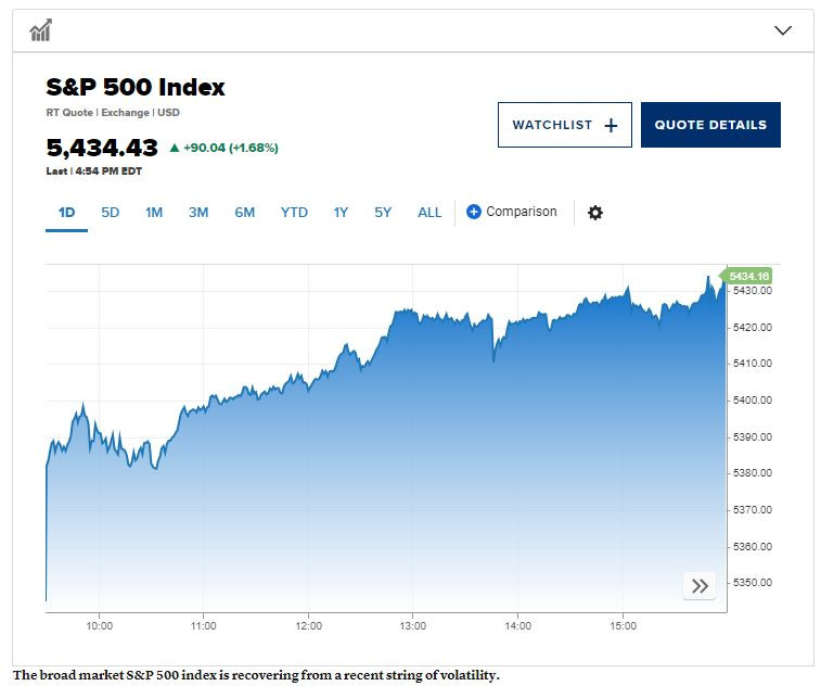 道瓊斯工業平均指數上漲408點,漲幅1.04%,收於39,765.64點;納斯達克綜合指數上漲2.43%,收於17,187.61點;而S&P500指數上漲1.68%,收於5,434.43點,距離7月創下的歷史高點不到5%。