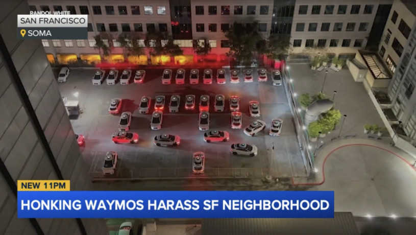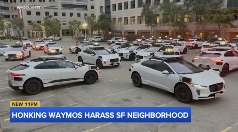 Waymo無人車停車場的車輛不時互相鳴笛。ABC7電視畫面