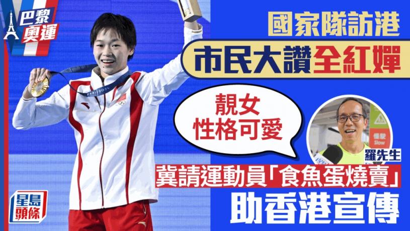 據《星島》了解,國家隊運動員將於8月29至31日來港訪問3日,行程包括參加「奧運健兒大匯演」等。《星島》記者今日(14日)前往將軍澳運動場了解市民看法。不少市民期望今年17歲的新晉「跳水女王」全紅嬋可隨團訪港,大讚她「又靚女、性格又可愛」,冀國家隊在港到處走走看看,以自身「流量」帶動香港旅遊。