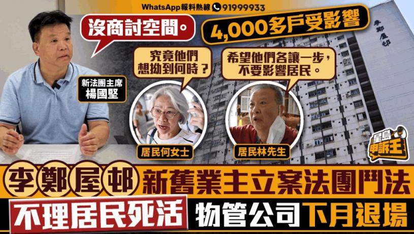 新舊業主立案法團鬥爭,將李鄭屋邨搞到「一鑊泡」。由於管理公司已表明在9月1日退場,情況逼切,深水埗區議員龐朝輝早前擺設街站,向居民講解情況。現場街坊紛紛大吐苦水,不滿兩個法團不理居民福祉。
