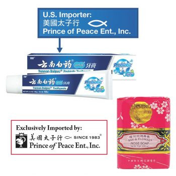 美國太子行為新加坡虎標萬金油、云南白藥牙膏與上海蜂花牌香皂唯一授權的全美總代理,深深明白民眾需要的是有效用、有保障、符合美國法規的正品,特別提醒民眾,在選購商品前,請務必認明包裝盒上清楚印有「US Importer全美總代理美國太子行 Prince of Peace Ent., Inc」才是經過各種檢驗、合法合規的正版授權真品,買的安心用的放心。