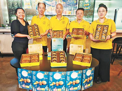 天福公司伍錫富董事長與同仁在記者會上介紹最新推出六位傳統珍飴月餅。