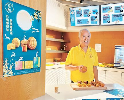 伍錫富董事長親自上場介紹「珍飴」月餅,無論是蛋黄或流心 奶黃月餅,切開後均會「漏油」,保証新鮮。
