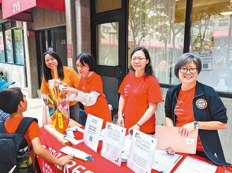 (右起)陳玉珍、黃美群等人在唐人街活動前進會的攤位。 李強攝