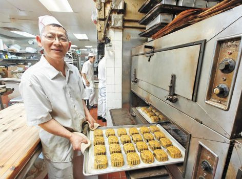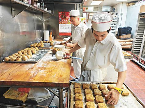 麗心的雙黃白蓮蓉月,油水足,令人垂涎欲滴。今年更推出全新裝璜,名貴大方,無論是賞月或送禮都深受僑胞歡迎。小圖為麗心餅屋的月餅技師正趕製各種中秋月餅應節。