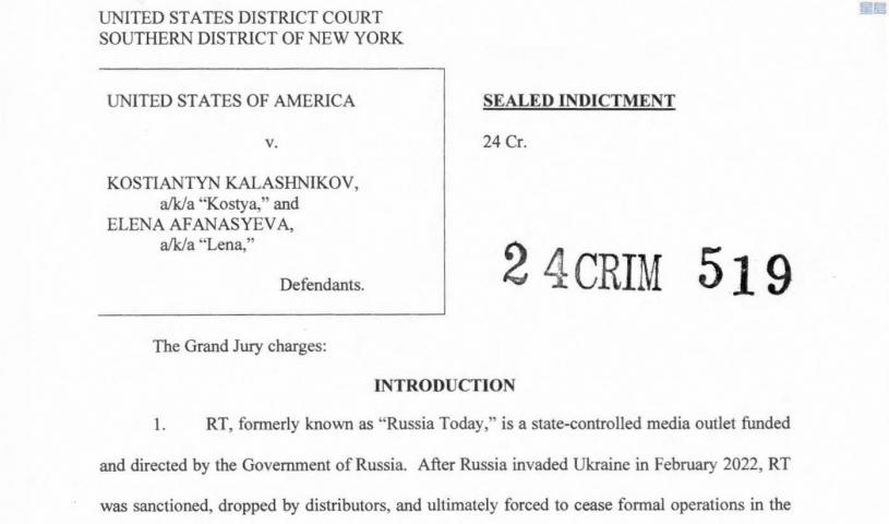 美聯社報道,司法部4日宣布起訴「今日俄羅斯」電視台的員工卡拉什尼科夫(Kostiantyn Kalashnikov)和阿法納西耶娃(Elena Afanasyeva),兩人被控串謀洗錢,以及未有登記便充當外國代理人的罪名。由於兩人身在海外尚未歸案,因此當局同時頒布制裁和旅遊限制措施。