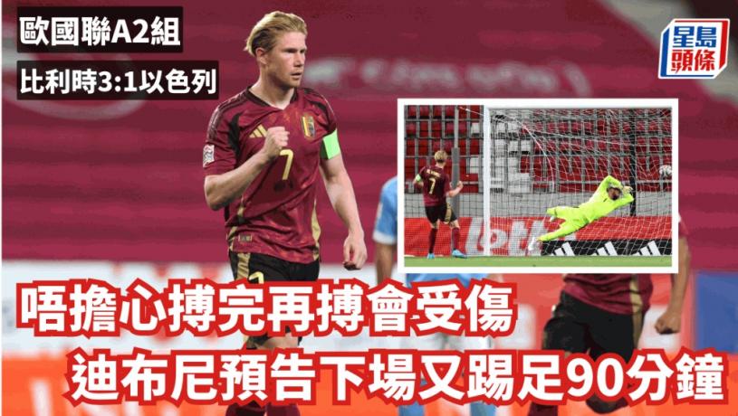 比利時在周五歐洲國家聯賽A2組首輪,憑隊長兼中場大腦奇雲迪布尼(Kevin De Bruyne)梅開二度,主場3:1擊敗以色列,全取3分。這名33歲中場預告下輪鬥法國,會像今仗一樣踢足90分鐘,但由於他在過去2季不停受傷,外界擔心他在國際賽拚盡會影響在曼城的演出,但他賽後笑言唔擔心藍月領隊哥迪奧拿會唔開心,更指最重要就是自己感覺狀態良好。