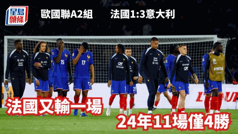 周五歐洲國家聯賽A2組第一輪,法國出師不利,主場1:3不敵意大利。連同今仗,法國在2024年11場各項賽事中,僅得4勝,勝率只有36%,是1992年以來最差,同時球隊連續2仗先入球後反勝為敗,自1962年後首次出現,全面失去強隊本色,教練迪甘斯叫外界不要怪責球員,要怪就怪他。