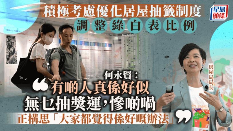 被問到居屋抽籤制度有些人「抽咗好多次都抽唔到」,何永賢表示透過政黨及不同團體均留意到情況,笑言「有啲人真係好似無乜抽獎運,慘啲喎」,稱會積極構思一些「大家都覺得係好嘅辦法」。至於綠白表四六比,何永賢稱或會一併調節,不過是加大白表抑或綠表的比例未有定論,因為兩者均有副作用,例如加綠表會加快公屋流轉,但白表人士會認為不公平,因此表示「同事真係要計吓數」作平衡。