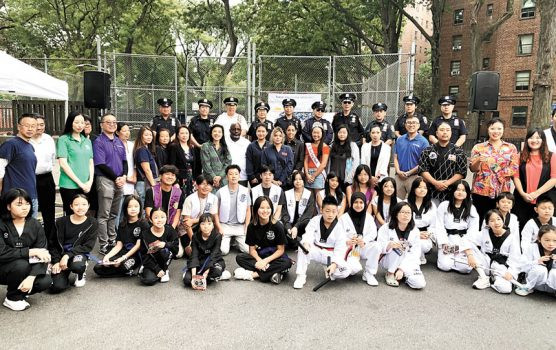 法拉盛商改區成員與市議員黃敏儀,紐州參議員劉醇逸代表和參展商家聯袂主持法拉盛商改區街坊節開幕儀式。