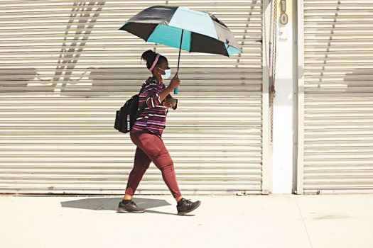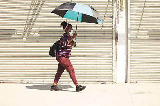 熱浪期間,洛市一名婦女撐傘在路上行走。洛杉磯時報
