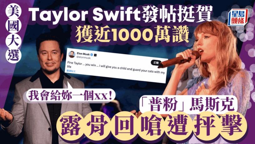 美國大選戰情熾熱,副總統賀錦麗與前總統特朗普在當地周二電視辯論唇槍舌劍,除了這兩位主角矚目,另一國際級名人也捲入這場戰火中,那就是美國流行音樂天后泰勒絲(Taylor Swift)。她在Instagram發文表態支持賀錦麗後,這則貼文約一日間獲得超過959萬個讚,當中不乏影視體育名人。而億萬富豪馬斯克則代特朗普反擊,在旗下社交平台X出貼文酸泰勒絲,留言說「我會給妳一個孩子」,令人聯想到他的意思是要令泰勒絲懷孕,當中帶有色情含意,惹來網民批評。