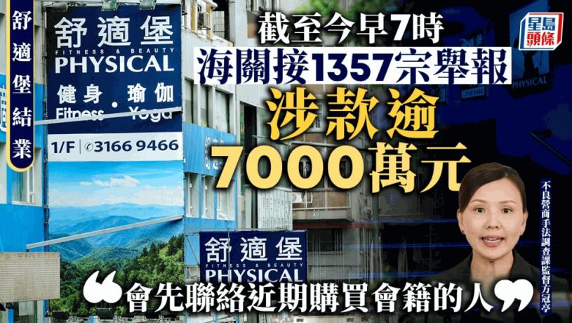 連鎖健身中心舒適堡於上周五(6日)宣布結業,海關於前日和昨日先後拘捕涉案男董事及女董事。海關指截至下午4時接獲1492宗舉報,涉款約7200萬元。