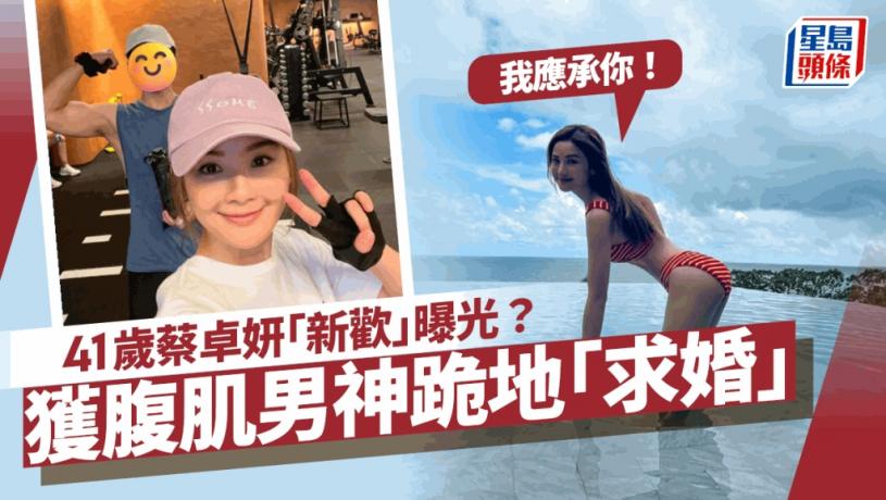 現年41歲的蔡卓妍(阿Sa)去年8月宣布與富三代「百億麻將館太子爺」石恆聰(Anthony)分手,結束6年情。有傳石恆聰搭上陳靜(DaDa)及2022年港姐季軍梁超怡,不過阿Sa回應時表示分手不涉及第三者介入,更心疼石恆聰被誣衊出軌。阿Sa回復單身後一直專注工作,近來為演唱會做Gym保持美好身段,繼早前阿Sa發起summer body challenge,與好友關智斌(Kenny)在社交網互晒泳照騷身材後,近日二人則孖住去健身室,期間更獲男方跪地「求婚」。