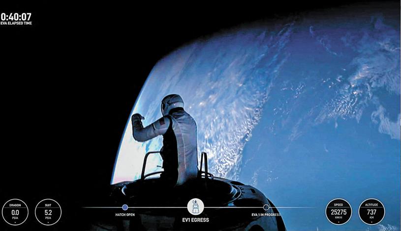 太空探索技術公司SpaceX的載人飛船12日完成人類首次由非職業太空員進行的商業太空行走任務。該任務由現年41歲的美國億萬富翁艾薩克曼和SpaceX工程師吉利斯出艙進行,兩人在艙外待了10多分鐘,距地面高度700多公里。SpaceX創始人馬斯克表示,公司計劃在兩年內向火星發射飛船,20年內在火星上建成一個自給自足的城市。