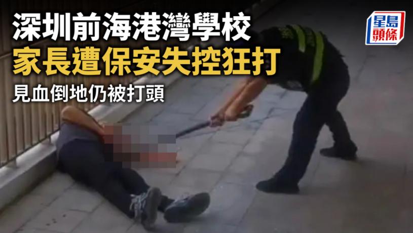 影片中,學校外牆上的校名LOGO與前海港灣學校官網顯示的一致。校門口不遠處,一名男子出血倒地不起,一名保安持械擊打男子頭部,眾人不斷叫「停手、停手」。現場,有人催促他人快打120,還有人為男子止血。