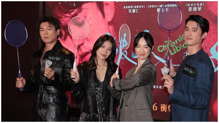 台灣電影《破浪男女》的四位主角吳慷仁、柯煒林、劉主平和梁湘華今日(14日)到圓方出席首映禮,四人分別戴上皮革手拷和捆綁雙手現身,又拿著羽毛球拍拍照,期間柯煒林教吳慷仁用廣東話講「我今晚想約你打羽毛球」,吳慷仁即說:「唔好唔好。」場面好笑。