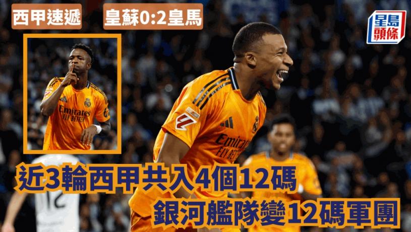 皇家馬德里周六西甲作客皇家蘇斯達,憑一對鋒將雲尼斯奧斯祖利亞(Vinícius Junior)和基利安麥巴比(Kylian Mbappe)各自攻入一記12碼,贏2:0全取3分。12碼入波,已成皇馬最主要的入球手段,連同今仗他們近5個聯賽入球有4球來自極刑,亦是2002至03球季以來第3支球隊在頭5輪西甲取得至少4個12碼入球的球隊。