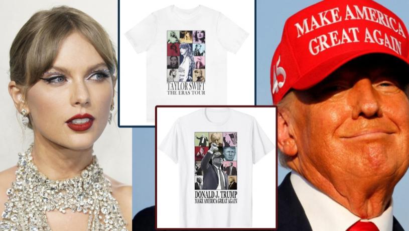 綜合英國《每日郵報》、美國《滾石》雜誌報道,特朗普競選陣營社交媒體官方帳號12日發布「MAGA」(讓美國再度偉大)系列最新宣傳商品「特朗普時代紀念T恤」(Trump Era shirt),整體與細節設計均與泰勒絲今年3月開唱的「時代巡迴演唱會」(The Eras Tour)紀念T恤極為相似,胸前的圖案設計,明顯模仿泰勒絲各張專輯封面彙成組圖的方式,以多張特朗普照片依樣畫葫蘆,正中央也如法炮製壓了特朗普的黑白照,照片裡的特朗普頭戴「讓美國再度偉大」帽子,T恤用色、字體也很相像。貼文發布24小時,瀏覽量已逼近620萬次。
