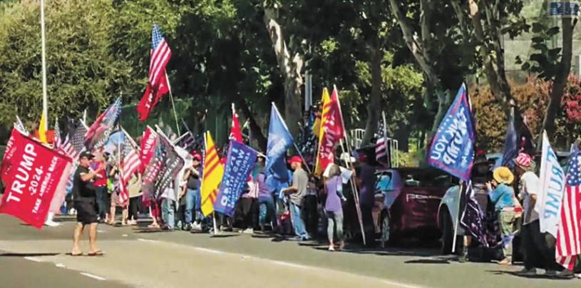 前總統特朗普13日到三藩市灣區林邊市(Woodside)參加籌款活動,大群支持者及反對者在籌款宴會舉辦場地外聚集。