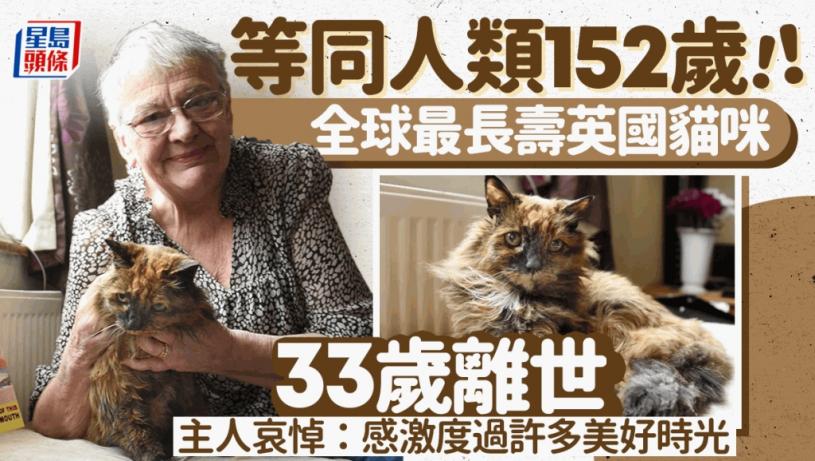 前日(14日),全球最年長的貓Rosie在英國東部羅福郡(Norfolk)諾域治(Norwich)的家中離世,享年33歲,其壽命相當於人類152歲。她的主人Lila Brissett表示,「我們一起度過美好的時光,我非常想念她」。