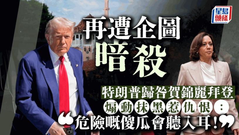 美國共和黨總統候選人、前總統特朗普再次遭人企圖暗殺,他周一(16日)開腔談論此事,將事件歸咎於民主黨總統候選人賀錦麗和現任總統拜登,指二人的「煽動性語言」導致他成為施襲目標。