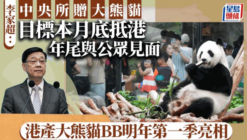 特首李家超於今日(9月17日)中秋節出席行政會議,是今年暑期復會後首次會議。他表示,就中央所贈的一對大熊貓,目標維持今月底可送到香港,年底與公眾見面;港產的龍鳳胎大熊貓,則期望明年首季與公眾見面。