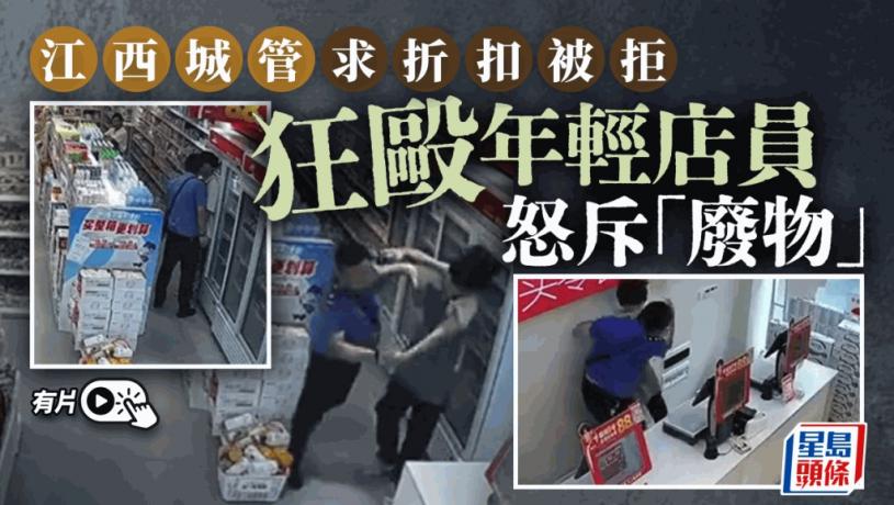 江西有城管在零食店搲折頭被拒後,惱怒成怒辱罵大學生店員「廢物」,雙方爆發口角,城管即情緒失控,推撞及拉扯大學生頭髮,二人終扭打一團由貨架打至收銀枱。當地城管局指,涉事人員已被停職調查。網民一面倒指摘涉事城管如同黑社會收保護費。