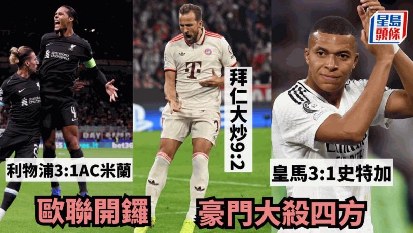 擴軍至36隊和更改分組賽模式後的歐聯,周二正式展開,多支頂級豪門立即打響頭炮,全取3分而回。當中拜仁慕尼黑憑射手哈利卡尼攻入4球,主場毫無留情9:2大勝薩格勒布戴拿模;皇家馬德里就有基利安麥巴比首次為球隊在歐聯上陣就有士哥,地頭3:1贏史特加;同日重頭戲,利物浦作客3:1擊敗AC米蘭,再次揚威聖西路球場。