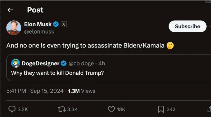 億萬富豪馬斯克(Elon Musk)在社交平台X發帖,質疑為何「無人試圖暗殺」現任總統拜登與副總統賀錦麗,迅速引來左右雙方陣營批評,指責這樣的言論等於煽動暴力。馬斯克一度拒絕刪帖但最後讓步,並表示自己只是開玩笑。白宮譴責其留言不負責任,特勤局則表示已知悉事件。