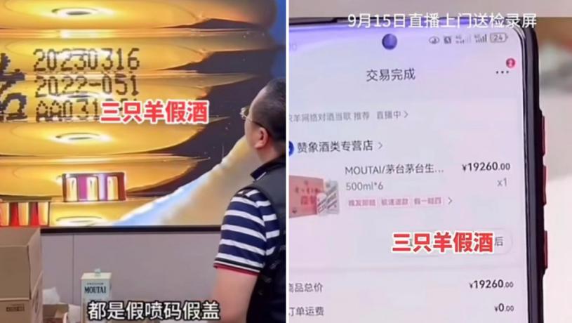 內地「三隻羊」陷美誠月餅風波,如今又有人稱,透過三隻羊購入茅台,後來經檢,鑒定不符合正品特徵。內地傳媒《大河報》報道,檢測人員所在的廣州中九檢測機構(廣州中九檢測鑒定有限公司)稱,在9月12日至15日期間已檢測出72瓶購自三隻羊團隊直播間、不符合正品特徵的「生肖茅台酒」。