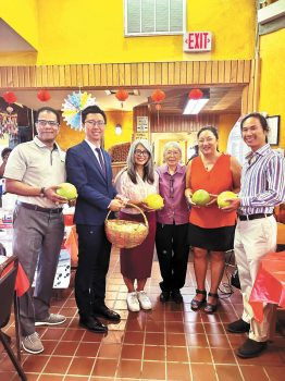 東南亞中心在16日中午舉行中秋節午餐聯歡會。圖右起:東南亞中心行政主任莫仲偉、伊州國會議員馬靜儀、東南亞中心創辦人之一鄔亮珊、第48區區長麗娜、台北經文處林家銘秘書等合影。 梁敏育攝