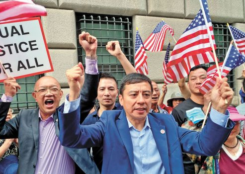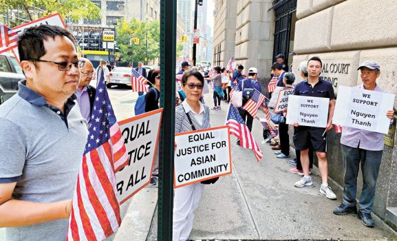 華裔民眾在法庭外舉拳支持阮成。張之銘攝