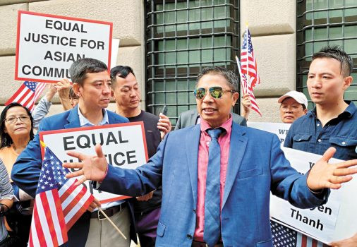 華裔民眾在法庭外支持阮成。張之銘攝