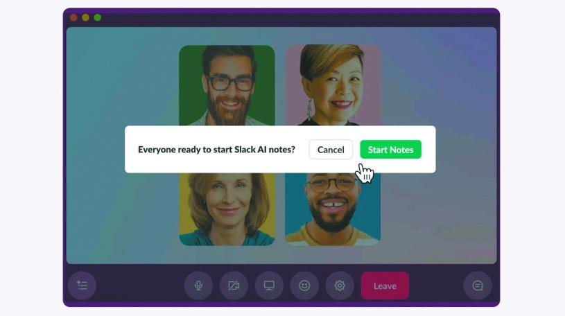 當受邀參加討論時,Slack AI會根據研討群組中共享的即時音訊和訊息建立文字紀錄。它還能將筆記、引用資料、行動項目和共享文件匯整到一個畫布中。所有參與討論的成員,即使無法參加,也可以之後查看這些筆記。
