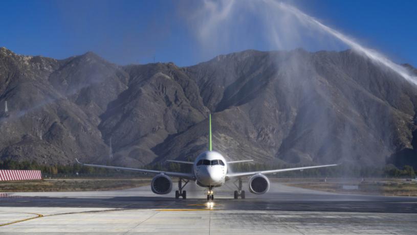 中國商飛指出,拉薩貢嘎國際機場位於雅魯藏布江河谷,海拔高度3569米,周邊山峰眾多,氣象環境複雜多變,對飛機高原運行性能有很高的要求。