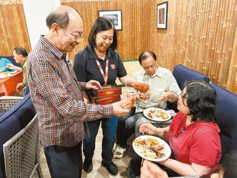馬樹榮(左)、馬劉愛瓊(中)中秋節為災民發送月餅。受訪人提供