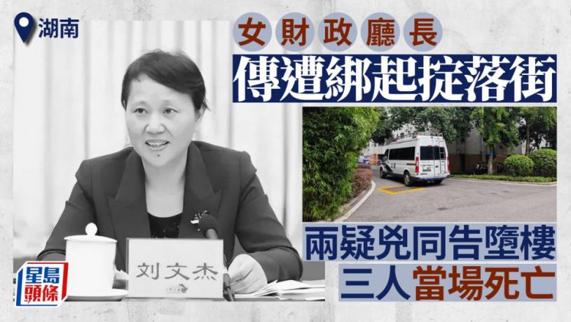 湖南省財政廳女廳長劉文傑,今日(19日)上午從居住的湖南財政廳院裡的住宅樓墮下死亡。同時也有另兩人墮樓,也當場死亡。互聯網有消息表示,劉文傑是被人綑綁著扔下樓,行兇的兩名男子隨後也跳樓自殺身亡。