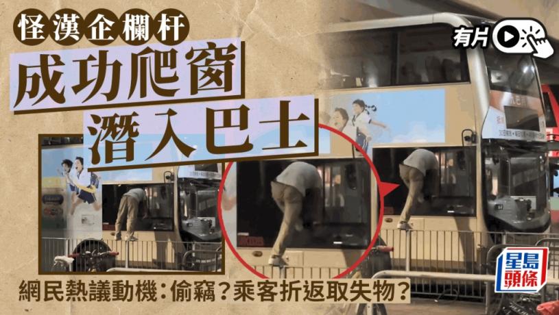 灰衫男小心翼翼從小窗爬入巴士內。網上片段截圖