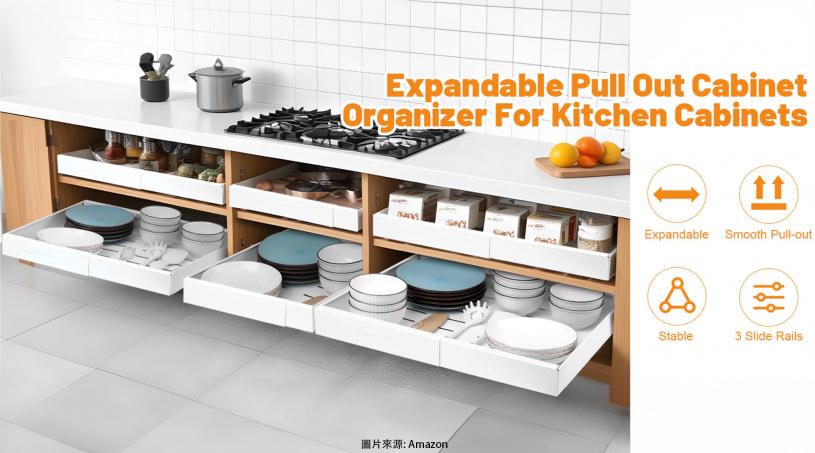 每次煮飯都能輕鬆找到需要的鍋具,不用再翻箱倒櫃找東西!Dntorx 廚房抽屜架(Dntorx Expandable Pull Out Cabinet Organizer)就是為你而生!尺寸為16.5 英吋深 x 20.3 英吋寬 x 2.8 英吋高,從12英寸拉伸到20.3英寸,無論你家的櫥櫃多大多小,它都能完美匹配。拉出式設計簡直太方便了,隨手一拉,所有物品盡收眼底,不用蹲下去找後排的瓶瓶罐罐了!它的滑動超平順,拉出完全沒有卡頓,還靜音!