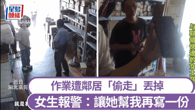湖北襄陽一名女學生隨家人旅行時,將寫完的作業寄回家。不料,快遞卻遭鄰居誤領走,並被當成垃圾丟棄。無奈之下,女學生只好報警,並要求鄰居幫她再寫一份作業。
