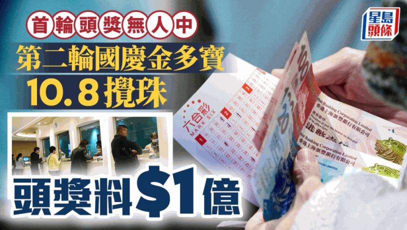 為慶祝國慶75周年,馬會首次舉行六合彩國慶金多寶攪珠,兩輪攪珠將分別於今日(10月2日)及下周二(10月8日)舉行,今期六合彩共錄得投注額逾1.68億元,由於今期頭獎無人中,累積多寶連同金多寶金額的總額8,000萬元會撥入第二輪國慶金多寶。馬會估計如以10元一注獨中,頭獎基金預計可高達1億元。第二輪國慶金多寶已開始接受投注,截止售票時間為下周二(8日)晚9時15分,同晚9時半攪珠。