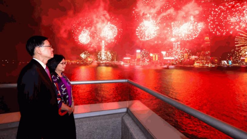 國慶75周年煙花大匯演今晚(10月1日)在維港上演,吸引超過33萬名市民和遊客在灣仔、中環和尖沙咀一帶觀賞。行政長官李家超表示,今年的國慶是香港特區完成《基本法》第23條本地立法、完善地區治理後的首個國慶,是別具意義的國慶。國慶前幾日,中央向香港贈送的兩隻大熊貓已經抵港,成為香港大家庭的成員,充分展示國家對香港的關愛和支持。加上最近出生的一對大熊貓龍鳳胎,以及牠們的爸爸媽媽──樂樂、盈盈,香港大家庭一共有6隻大熊貓,讓香港在國慶歡騰的日子喜上加喜。