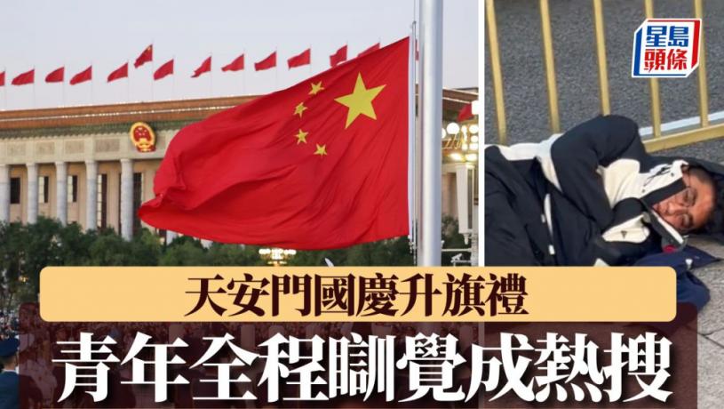 國慶75周年,有逾12萬民眾捱更抵夜湧到北京天安門廣場參觀升旗禮,但有青年男子疑不敵睡魔,竟在現場席地而眠,直至升旗禮結束仍未瞓醒,成為網上熱搜。