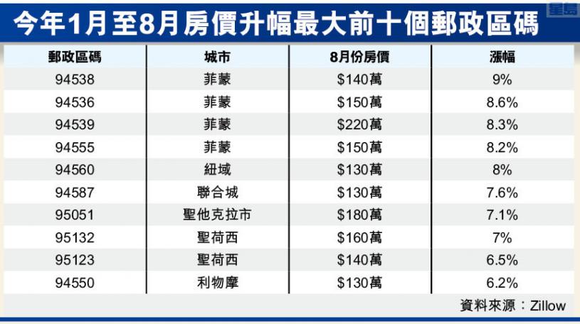 9%漲幅是Zillow數據中200個灣區人口最多郵政區碼中最大的,緊隨其後的是菲蒙另外三個郵政區碼(從150萬到220萬元)和鄰市紐域(Newark)一個郵政區碼。