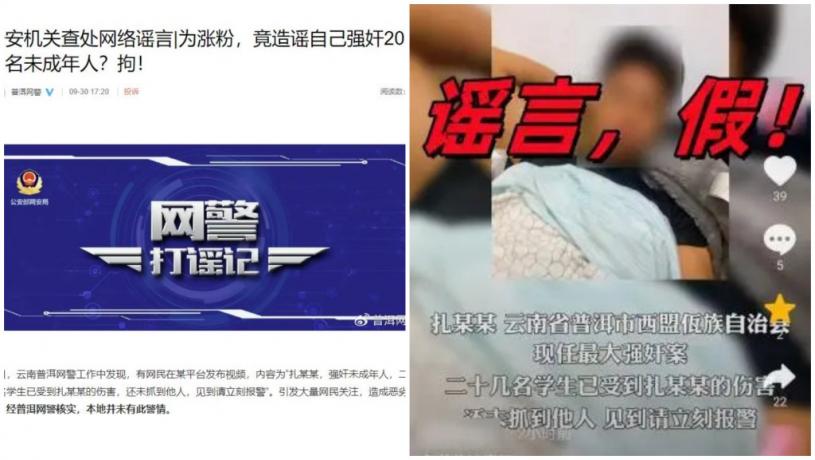 後經工作查明,信息發布者跟視頻中扎某某竟是同一人。據扎某某供述,他為引流漲粉,以自己照片做背景並配上文字,捏造自己強奸二十多名未成年學生的虛假信息發布於網絡,天真地以為造自己的謠不違法。最終,普洱網警依法對扎某某處以行政拘留。