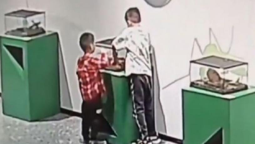 兩名小孩涉嫌在博物館中偷昆蟲。影片截圖