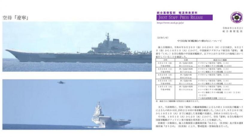 日本軍方公布中國遼寧艦航母在西太平洋的活動情況。