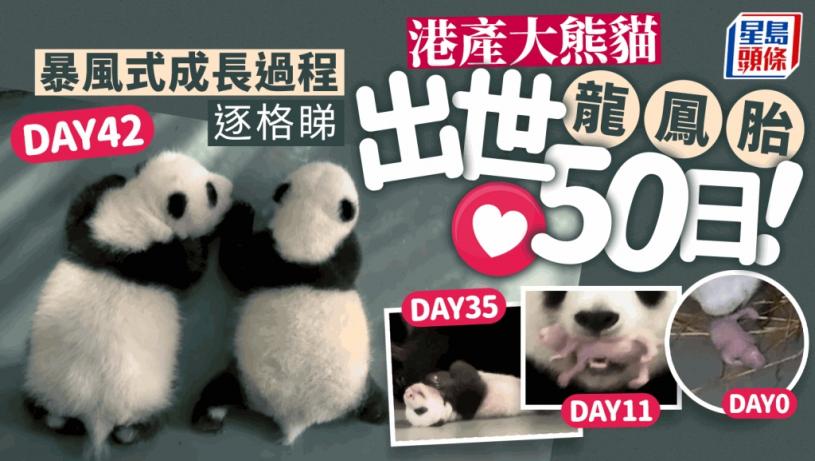 海洋公園大熊貓盈盈上月誕下龍鳳胎,大孖及細孖今日( 5日 )已50日大,海洋公園亦發布新短片,記錄牠們50天的暴風成長片段。