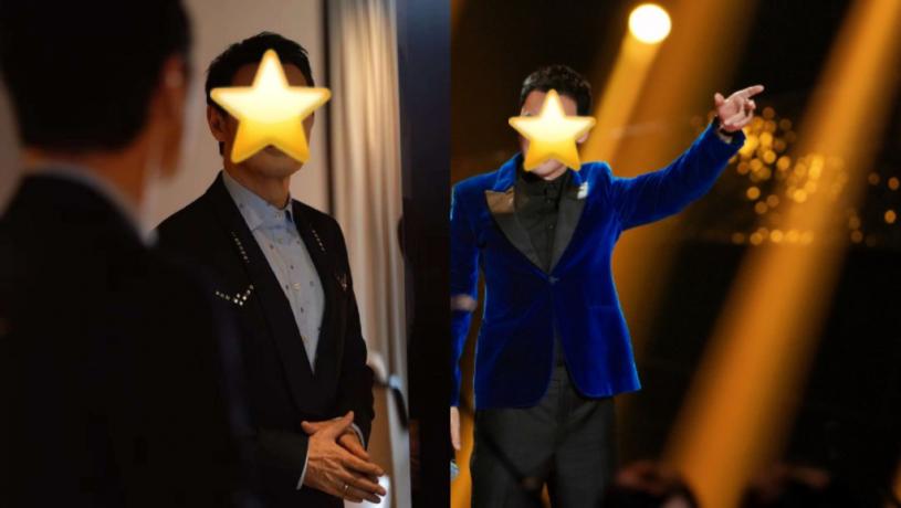 鍾鎮濤與影帝梁家輝在台上唱歌,氣氛歡樂。